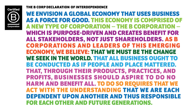 The B Corp (Benefit Corporation) movement was established in 2006 and set out to harness the power of business as a force for good.  The three pillars of the B Corp movement are people, planet and profit. The order is significant. The B Corp Community has grown into a global movement of over 7,800 businesses in 92 countries across 161 industries with 708,300 workers, all committed to bring real benefit to stakeholders, not just shareholders.