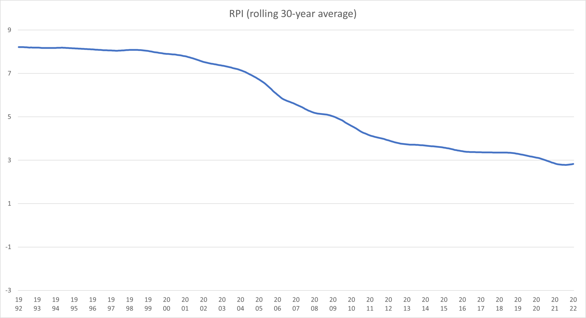 Our cash-flow models are long term illustrations and use long-term rolling averages. Here’s a chart showing 30 year rolling average inflation. Planning is by nature a forward-looking endeavour and financial plans are likely to run over several decades. So, it makes sense to use figures that reflect our experience over similar periods.