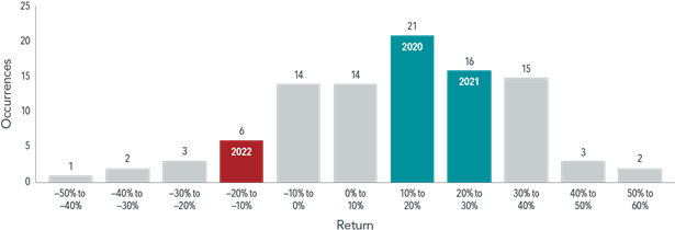 Distribution of calendar-year S&P 500 returns, 1926–2022