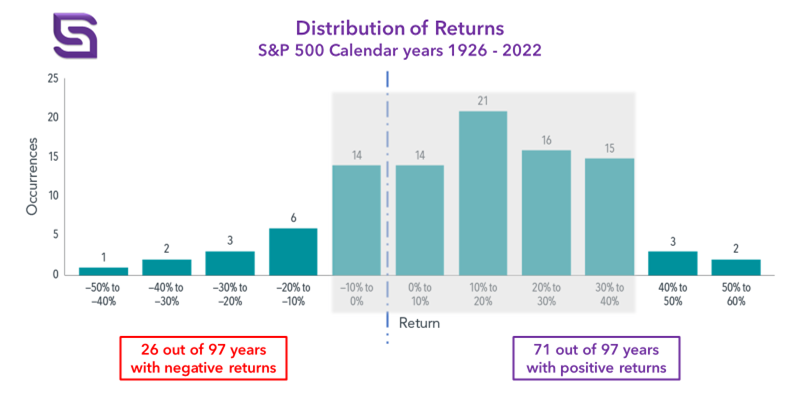 Seeing the spread of returns highlights a number of important facts. Firstly, returns lean toward positive outcomes being more common. In fact, there have been 71 years of positive returns compared to 26 years that were negative.